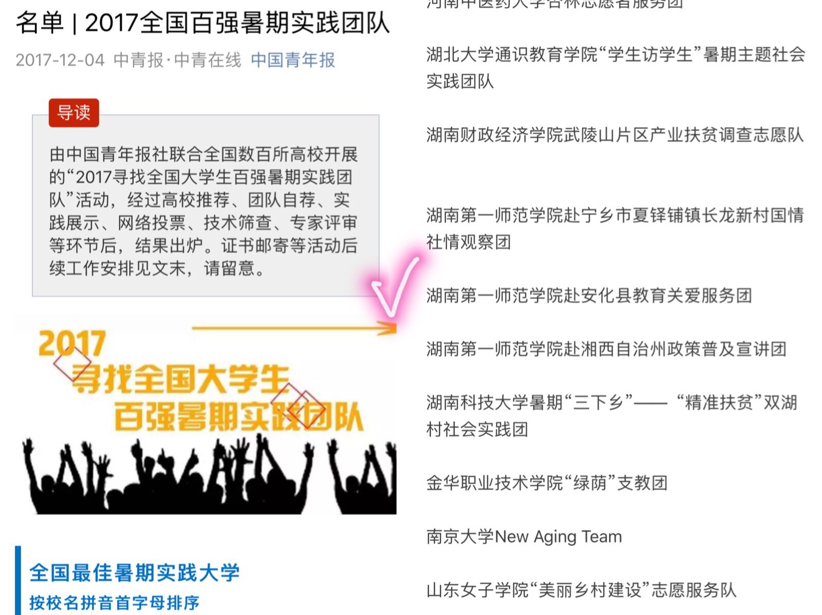 在团中央未来网启动的“奋斗中国梦·实践致青春2017年全国大中专学生暑期‘三下乡’新媒体公益传播力展示活动”中,金年会三下乡团队“赴安化县‘重走主席游学路’教育关爱服务团”成功入围“优秀团队”、“优秀报道”和“最美中国发现”奖项,学院辅导员唐瑞鸿入围“优秀指导老师”奖项。