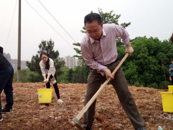 植树现场,学院党总支书记王杰文与老师同学们拿起铁锹、锄头热情地参与到植树活动中。同学们被领导老师的热情所感染,有的挥锹铲土,有的扶树填土,有的培土浇水,忙得不亦乐乎。王杰文书记一边用力地挥动着锄头一边向同学们传授着植树要领:“挖土下去那一下要使劲!土里面的石头要拣出来!”。经过将近一个小时的劳动,100多棵树在山坡上“安家落户”,为一师校园添上了一抹“信工绿”。虽然在植树过程中下起了雨,泥巴裹满了老师、同学们的裤腿,但是金年会师生仍然坚持完成了植树任务。