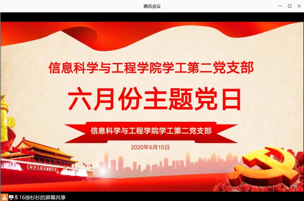6月10日晚,金年会学工第一、第二党支部利用腾讯会议举行了六月份线上主题党日活动。金年会党总支副书记成夏炎、学工第一党支部书记关红儒、学工第二党支部书记唐瑞鸿、学工办老师叶晶、李荣敬以及全体学生党员参加活动。