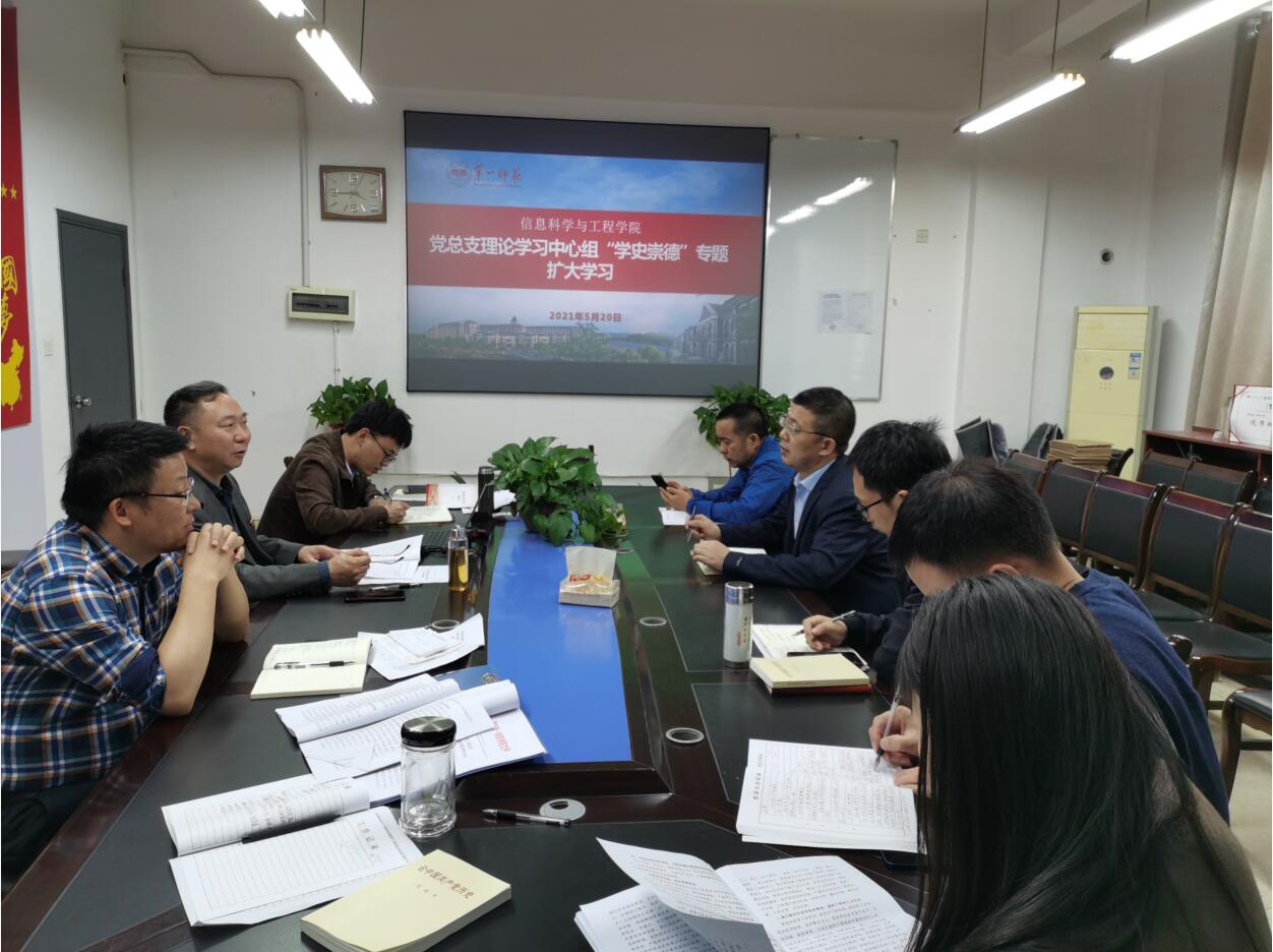 5月20日下午,学院党总支理论学习中心组在玉衡北407开展“学史崇德”专题扩大学习活动。学院领导、党总支委员及金年会学校第二次党代会代表参加。活动由党总支书记王杰文主持。