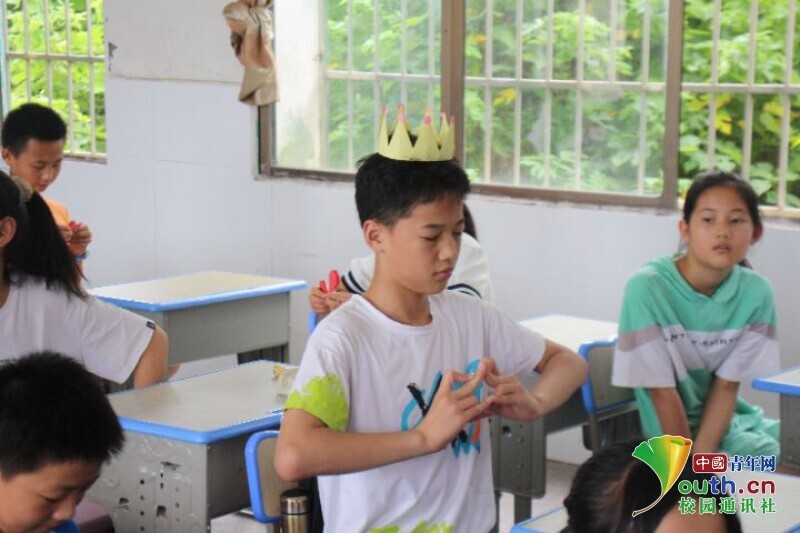 图为孩子戴上自己制作的折纸皇冠。中国青年网通讯员 段新利 摄