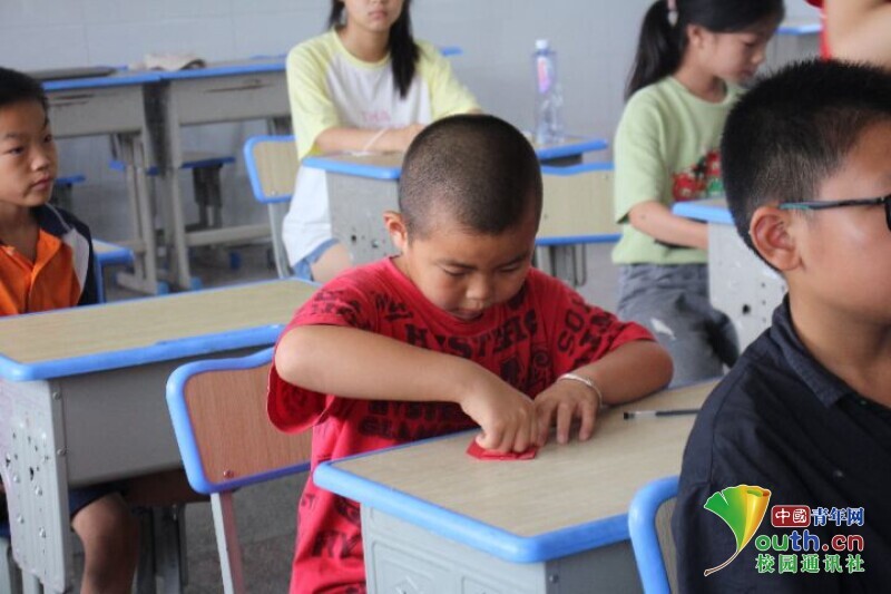 图为孩子在听了志愿者讲解折纸步骤和示范之后,亲身实践,进行折纸活动。中国青年网通讯员 段新利 摄