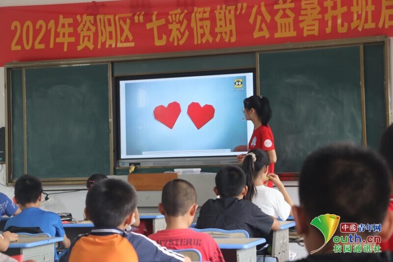 图为志愿者向孩子们演示如何将一张张彩纸彩纸折叠成爱心的形状。中国青年网 段新利 摄