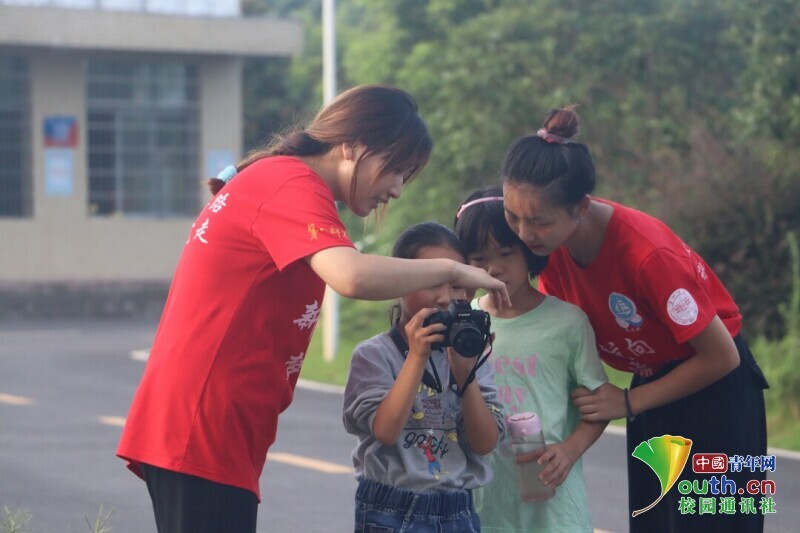 图为志愿者弯腰在教对摄影感兴趣的孩子用相机。中国青年网通讯员 段新利 摄