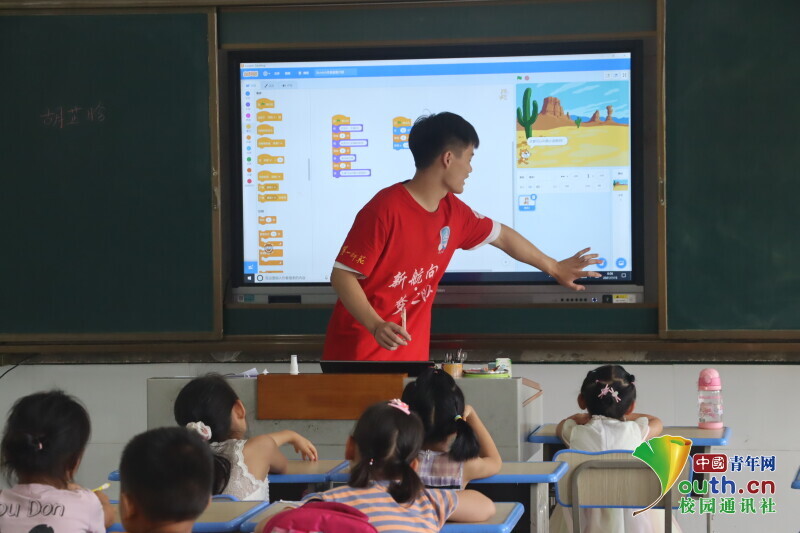 图为志愿者老师用Scratch软件给孩子们上少儿编程课。中国青年网通讯员 段新利 摄