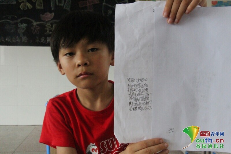 图为学生在上完诗歌朗诵课后,勇敢把自己的作品展示给志愿者老师看。中国青年网通讯员 欧阳健 摄