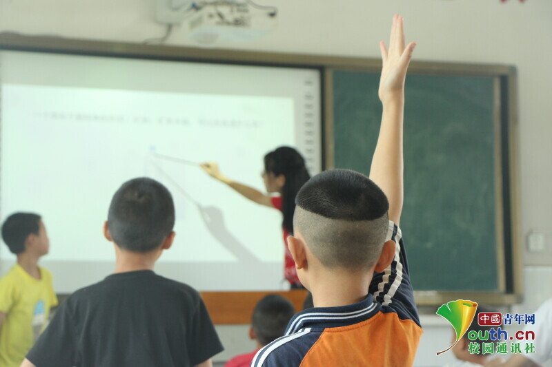 图为志愿者老师提出问题,学生勇敢举手,希望能够回答问题。中国青年网通讯员 欧阳健 摄