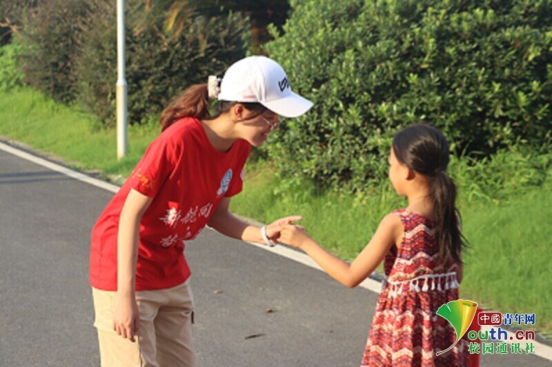 图为学生将小饼干送给自己最喜欢的志愿者老师。中国青年网通讯员 欧阳健 摄