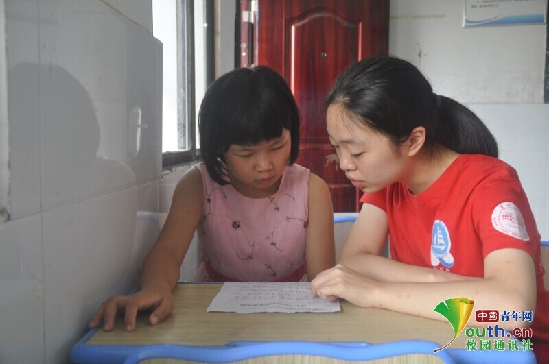 图为学生对舞蹈感兴趣,遇到了难题,勇敢找志愿者老师谈心。中国青年网通讯员 欧阳健 摄