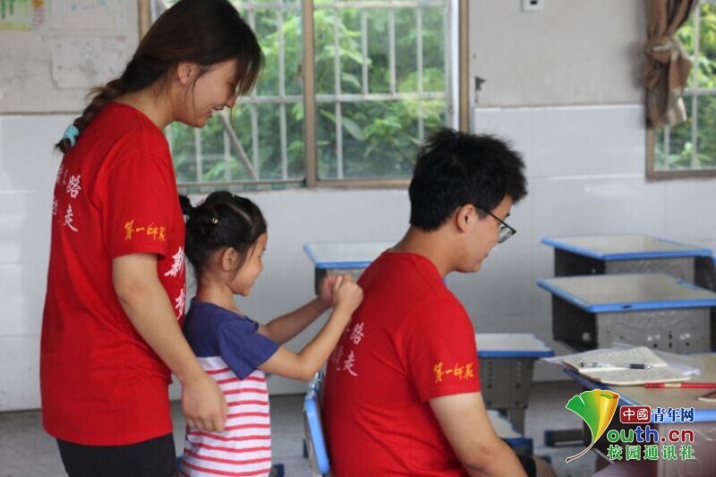 图为下课后一位同学主动给刚上完课的队员捶背。中国青年网通讯员 段新利 摄