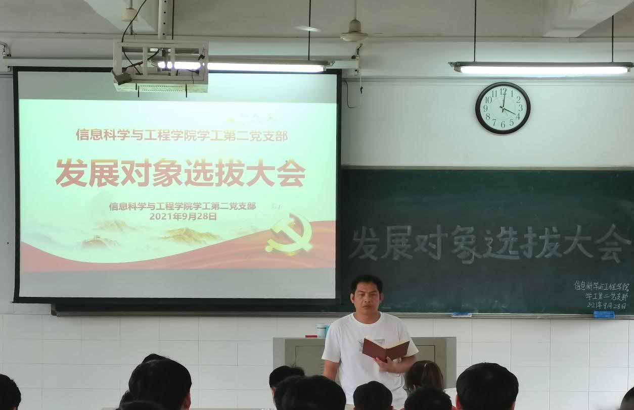 2021年9月28日,金年会学工第一、第二党支部通过线上与线下结合的方式召开本次发展对象选拔大会。与会人员有学工第二党支部书记李荣敬,全体学生党员和51名入党积极分子。大会分别由苏琴、张旭主持。