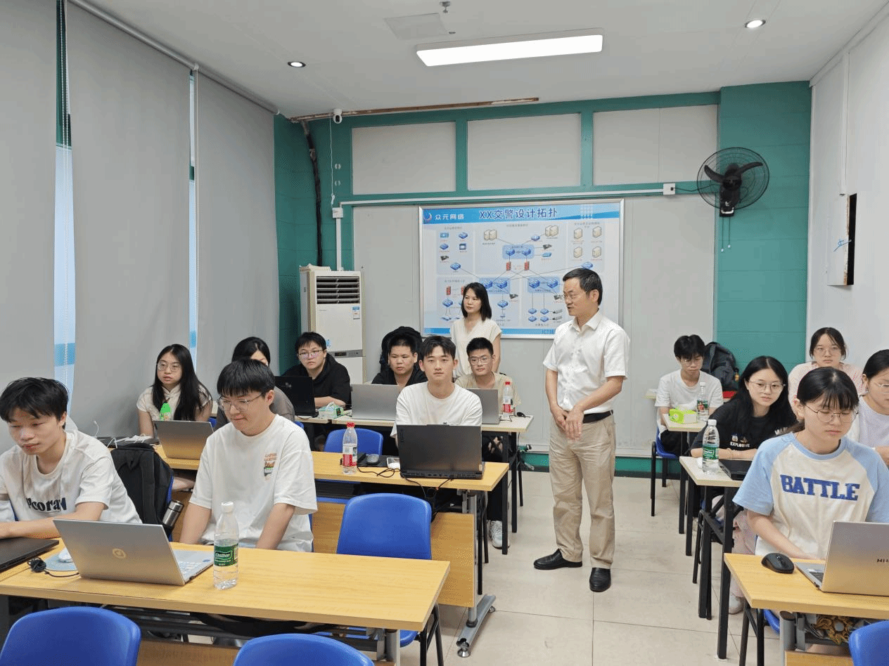 走访中,学院领导与学生面对面交流,详细了解他们在网络技术实践中的具体操作情况。学生们分享了配置VLAN隔离不同业务网段、通过链路聚合提升网络带宽利用率等实操案例。杨恒伏鼓励学生们珍惜企业实践机会,重点提升网络架构设计与故障处理等核心技能,为未来从事网络工程师、系统集成等岗位积累经验。