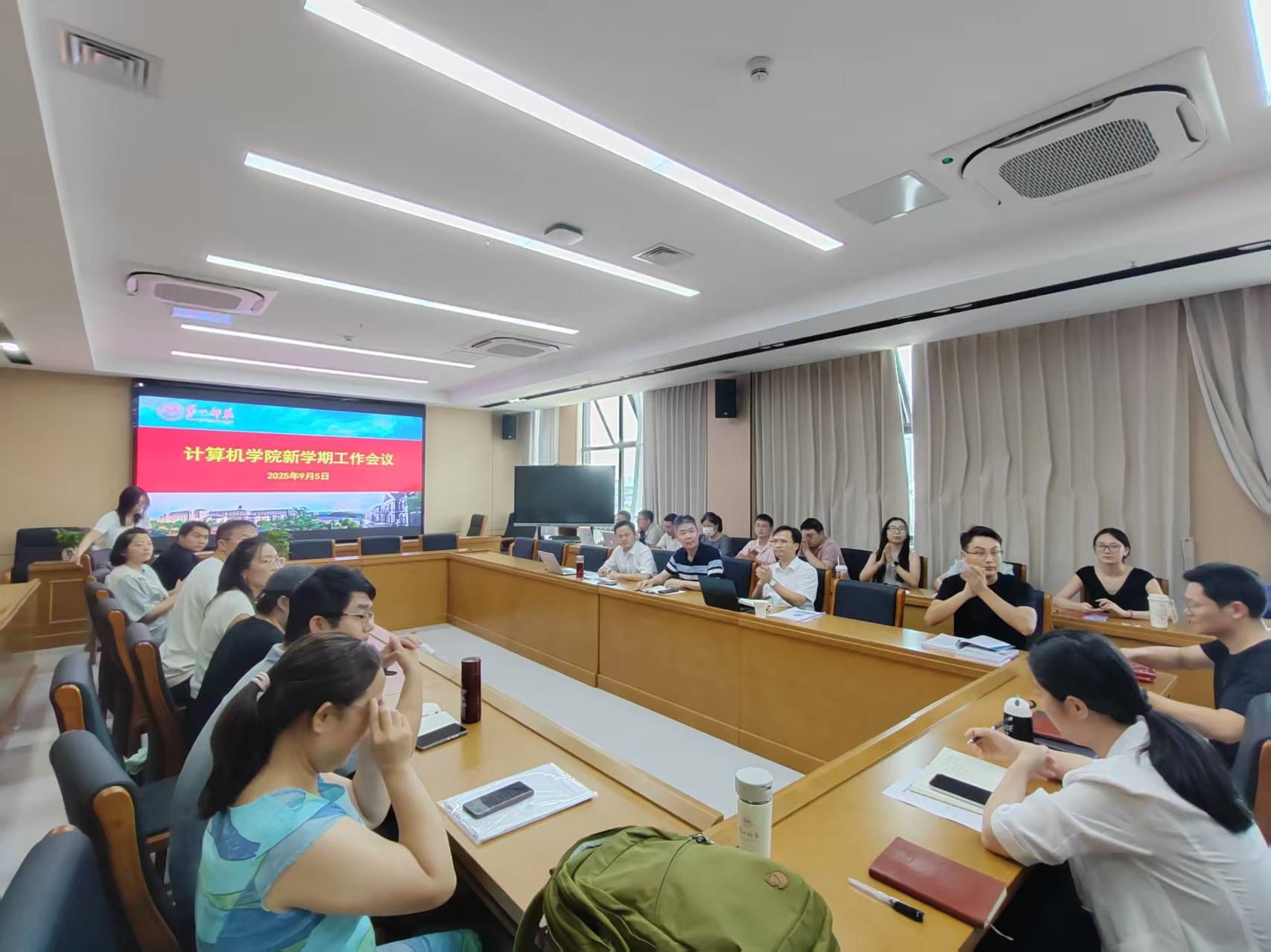 会议聚焦教学科研、学生工作、审核评估、学科建设与人才培养等重点工作,全面部署新学期工作任务。刘大维首先介绍了新入职教师,并邀请他们依次作简短自我介绍及入职感言,并就学生思想政治教育、迎新工作方案及学风建设等作专项部署。副院长杨梦云全面汇报暑期教学科研工作进展,并对新学期教学安排、科研项目申报及实验室建设等重点工作进行部署。