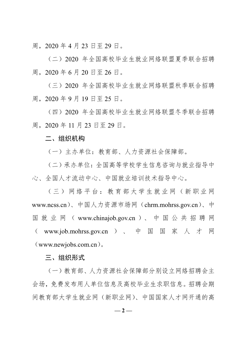 教育部办公厅 人力资源社会保障部办公厅关于举办2020年全国高校毕业生就业网络联盟招聘周活动的通知